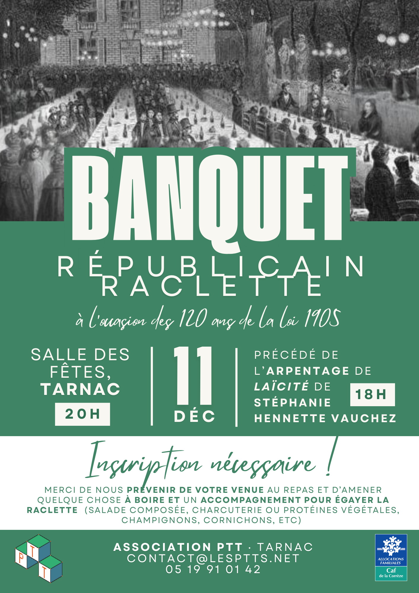 Les inscriptions, qui doivent nous permettre d’ajuster au mieux les quantités; sont ouvertes jusqu’au mardi 9 décembre inclus via le lien : https://framaforms.org/banquet-republicain-du-11-decembre-1761814049, par mail à contact(at)lesptts.net ou par téléphone au 05 19 91 01 42. Au-delà de cette date, il est toujours possible d’ajouter ou d’annuler une réservation, le plus tôt étant évidemment le mieux.